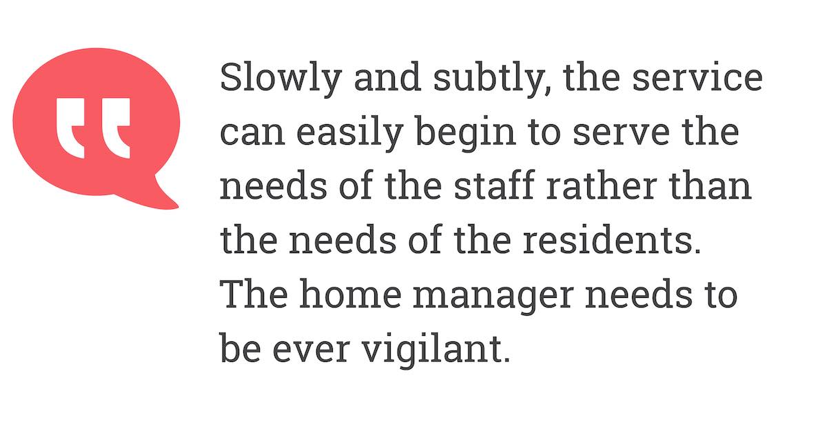Slowly and subtly, the service can easily begin to serve the needs of the staff rather than the needs of the residents.