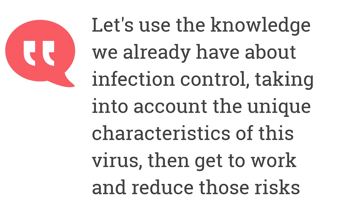 Let’s be mindful of the big picture and use the knowledge we already have about infection control, dealing with an outbreak, taking into account the unique characteristics of this virus, then get to work and reduce those risks as much as possible.