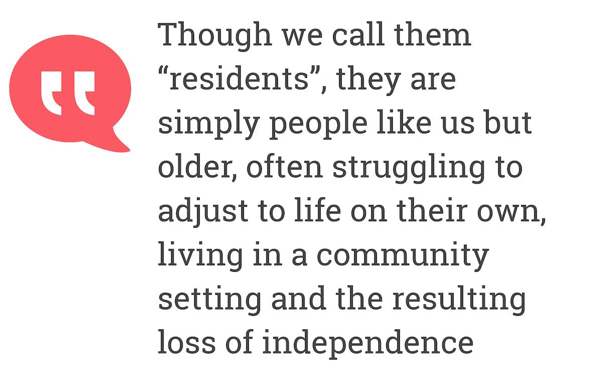 Though we call them “residents”, they are simply people like us but older, often struggling to adjust to life on their own, living in a community setting and the resulting loss of independence.