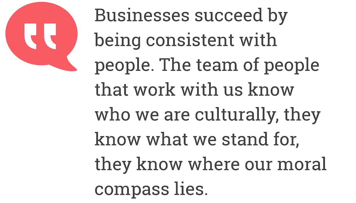 I have a very, very good MD who keeps me honest. And, I think the thing that I've learned from her, more than anything, is that businesses succeed by being consistent with people. I would like to think that the team of people that work with us know who we are culturally, they know what we stand for, they know where our moral compass lies, our ethics, our belief in how we deal with people and the business. We're always honest, we're always fair. I think if you can keep that consistency going at all times, it doesn't matter how hard the going gets, then people will respond to that well and they trust you. I think it builds a trust over a long period of time.