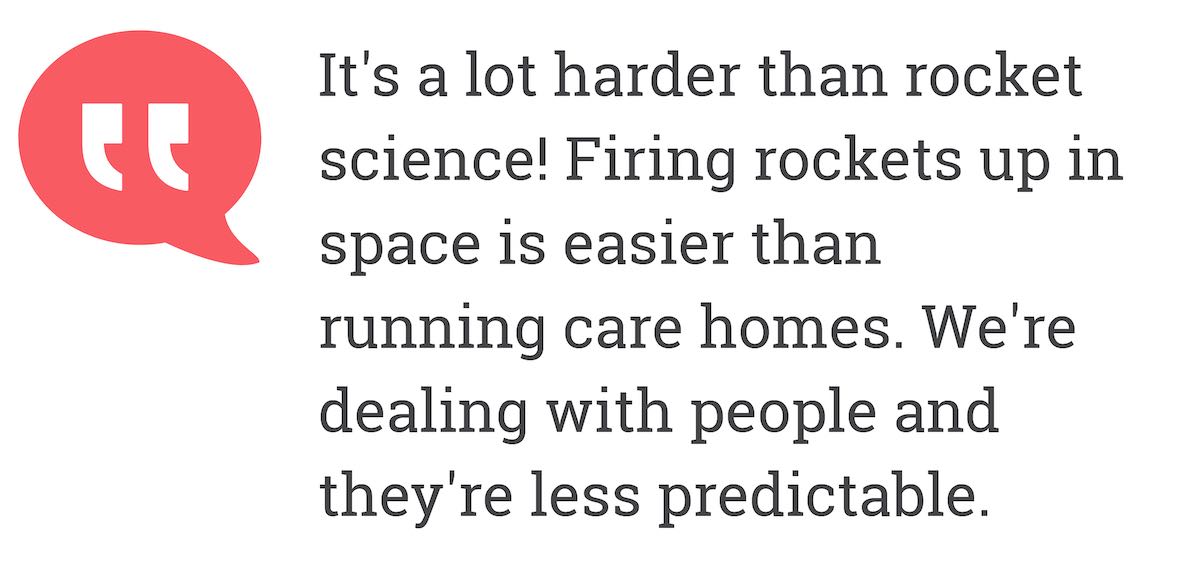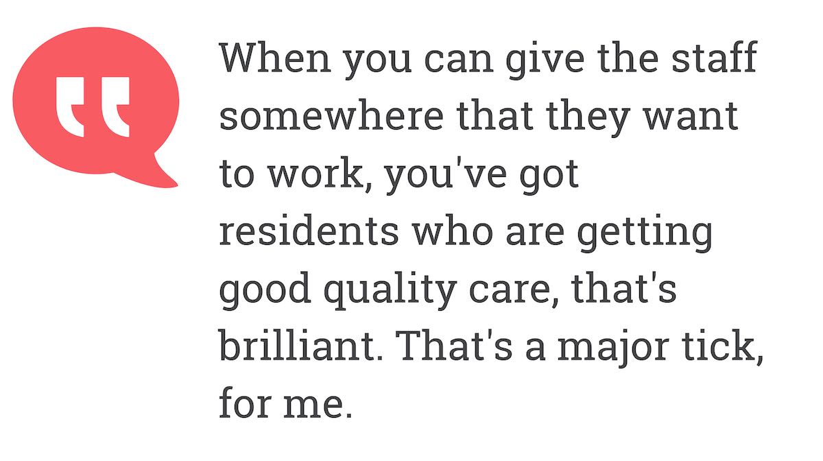 But, I realized that there are people who are very good at it, and that's how I ended up here. But, I wouldn't do anything else now, if I'm honest. It's not just the fact that, hopefully, I've got a lot of experience in this particular field. I know it sounds a bit trite, but actually when you go into a care home that's got problems, and it's not well run, and the residents are not having a great experience of their final years and you can turn that around, and you can give the staff somewhere that they want to work, you've got residents who are getting good quality care, that's brilliant. That's a major tick, for me. I think that's where all of our staff get the buzz.