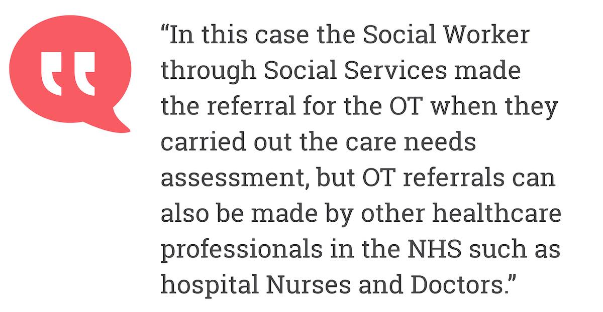 In this case the Social Worker through Social Services made the referral for the OT when they carried out the care needs assessment, but OT referrals can also be made by other healthcare professionals in the NHS such as hospital Nurses and Doctors.