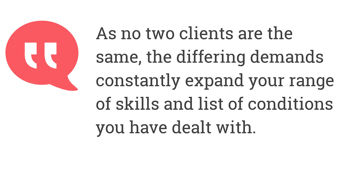 As no two clients are the same, the differing demands constantly expand your range of skills and list of conditions you have dealt with.