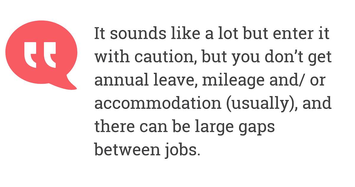 It sounds like a lot but enter it with caution, but you don’t get annual leave, mileage and/or accommodation (usually), and there can be large gaps between jobs.