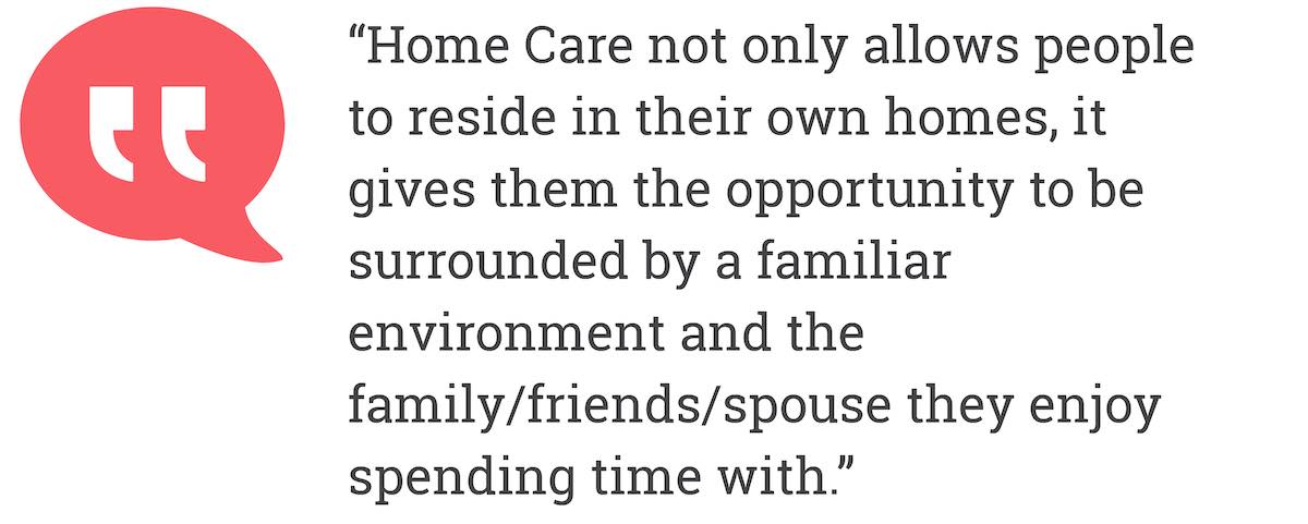 Home Care not only allows people to reside in their own homes, it gives them the opportunity to be surrounded by a familiar environment and the family/friends/spouse they enjoy spending time with.