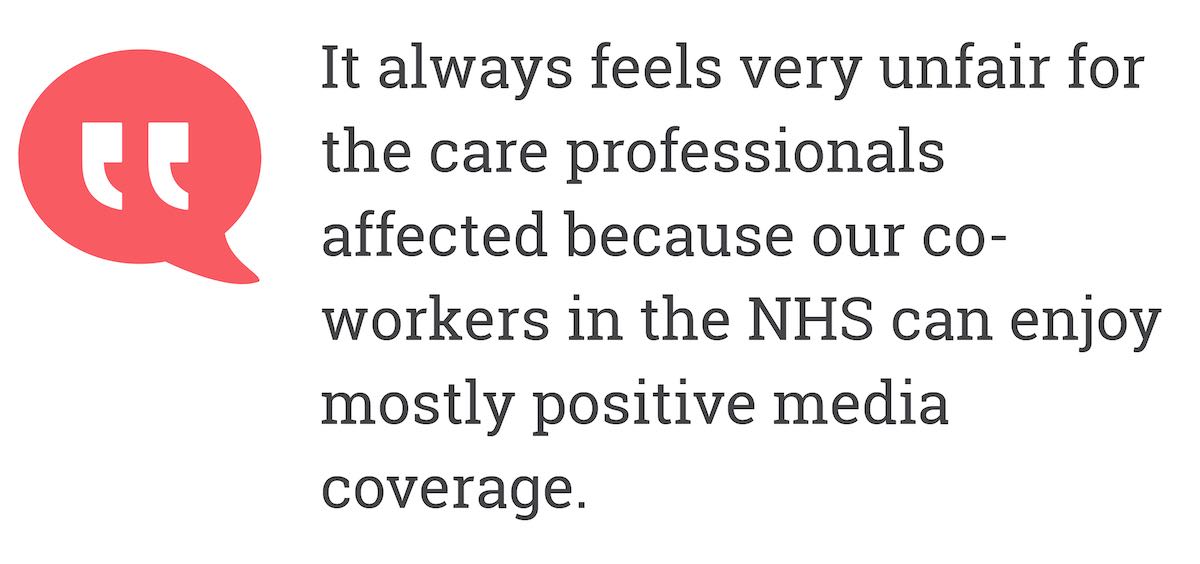 "it always feels very unfair for the care professionals affected because our co-workers in the NHS can enjoy mostly positive media coverage"Our perception of social care is shaped by the media. Stories tend to be about one of three negative themes - care home profiteering, harm or neglect. It’s time this changed.