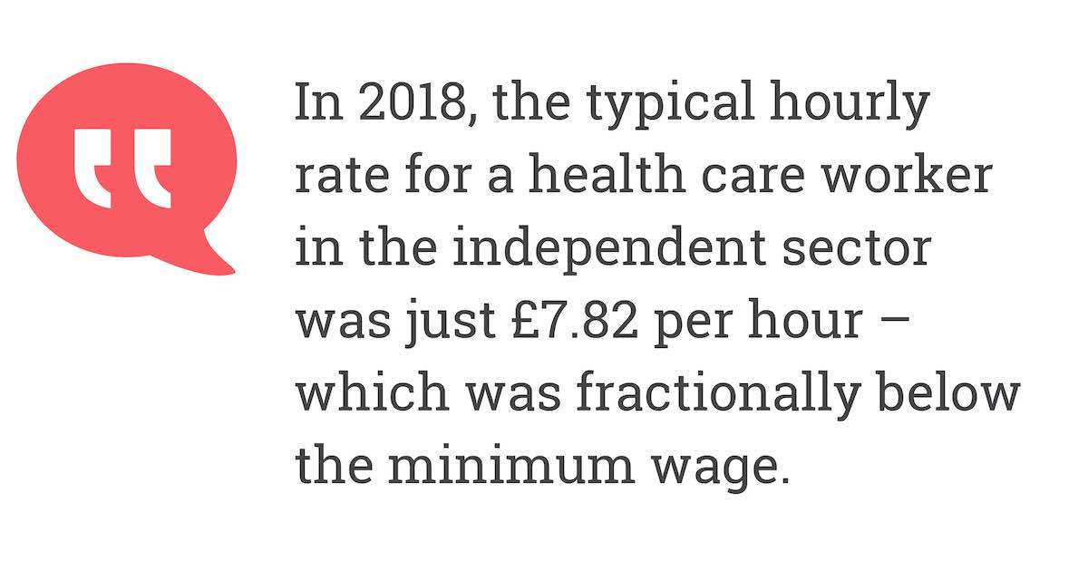 In 2018, the typical hourly rate for a health care worker in the independent sector was just £7.82 per hour – which was fractionally below the minimum wage.